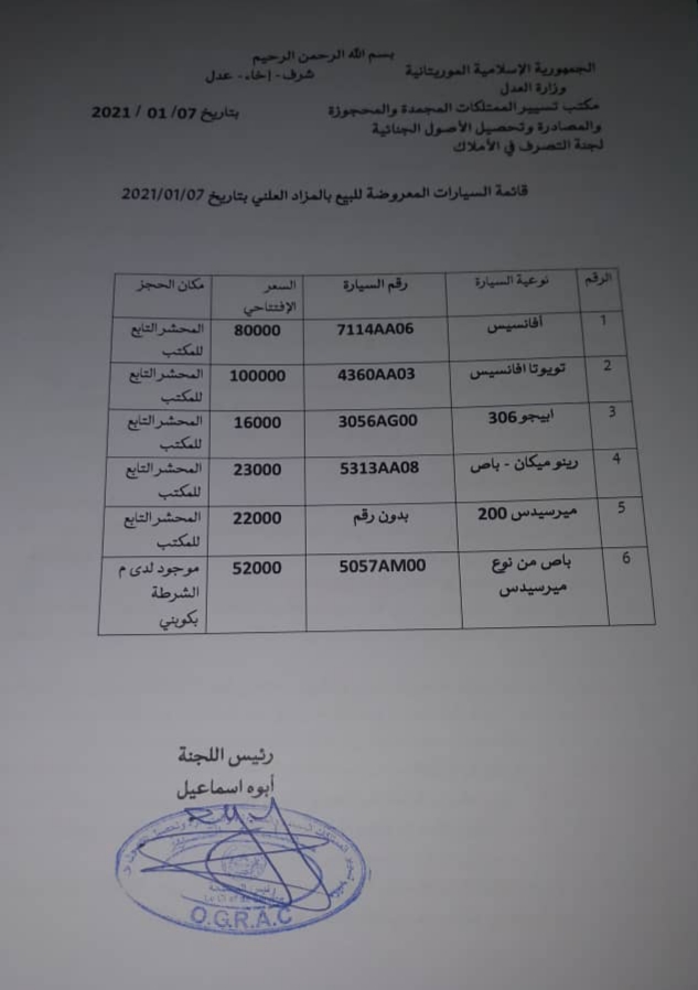 تعلن لجنة التصرف في الأملاك عن تنظيم مزاد علني لبيع بعض المحجوزات (المبينة في الصورة المرفقة) بعضها في انواذيبو والبعض الآخر في المحشر التابع للمكتب، وعلى الراغبين في المشاركة في هذا المزاد التقدم بعروضهم عبر الإستمارة المرفقة مصحوبة بوصل دفع مبلغ 1000 اوقية لدى الخزينة العامة ، في الفترة ما بين يوم الخميس الموافق 01/07/2021 إلى غاية يوم الأثنين الموافق 12/07/2021 في ظروف مغلقة أو عن طريق ارسال